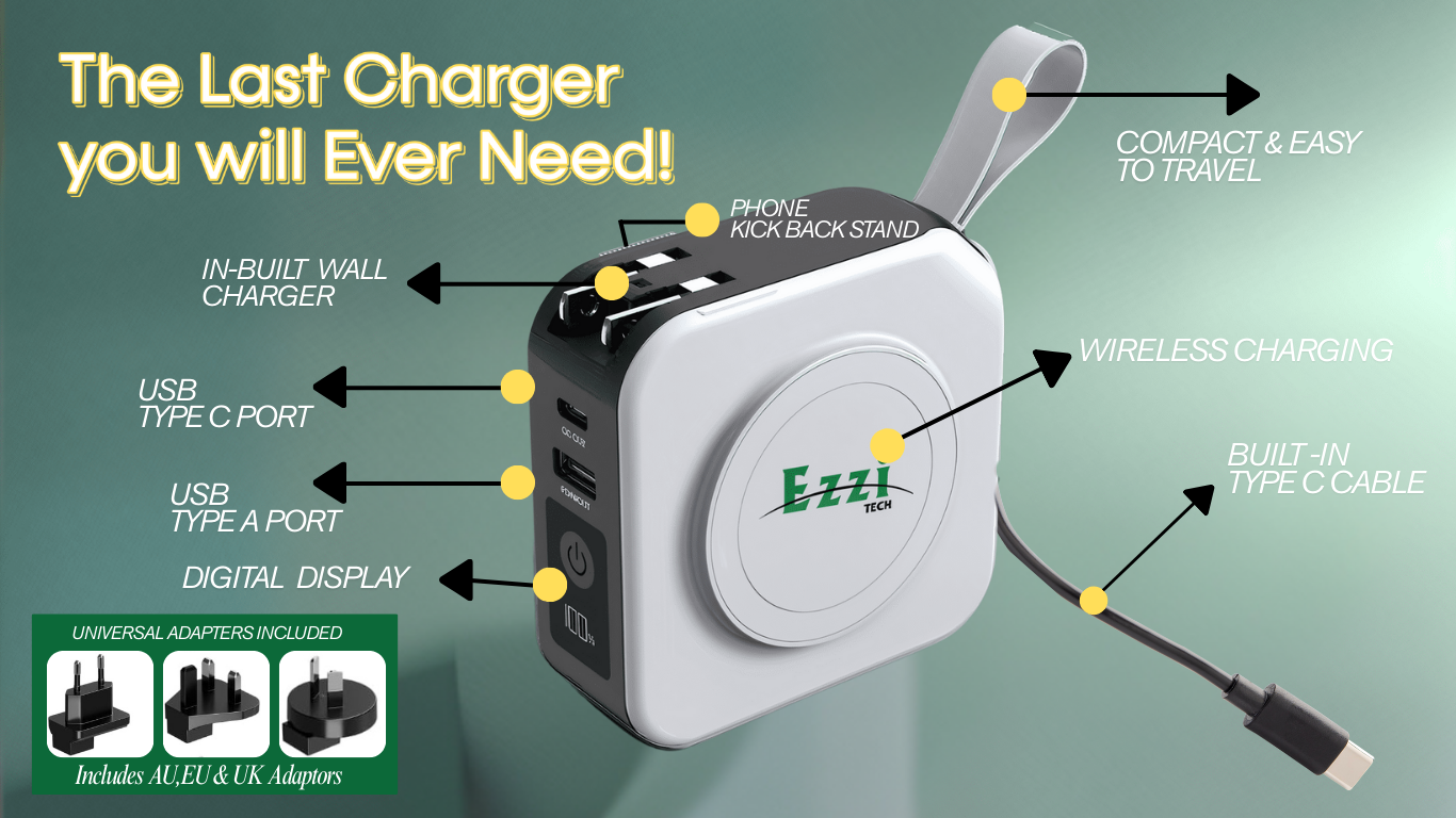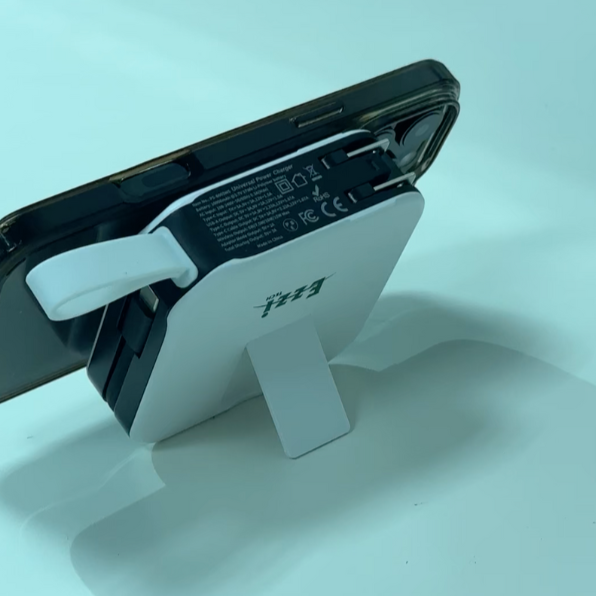 Discover the ease of travel-friendly charging, power your devices cable-free with a built-in Kickstand on the go!